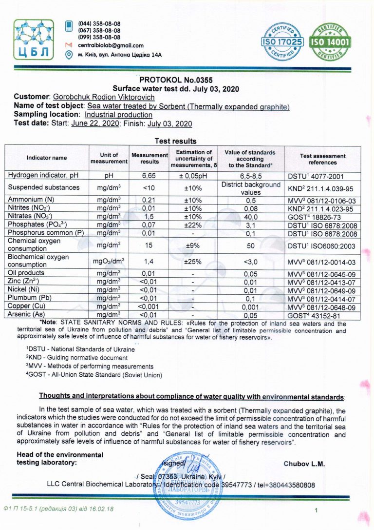 Certificate that confirms the safe use of large amounts of expanded graphite in waters.